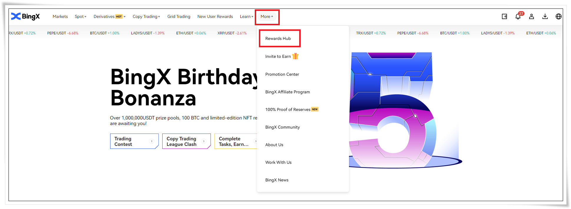 증정금 이벤트에 참여하기 위해서는 빙엑스 거래소에 로그인을 한 뒤 상단에 있는 More 탭에 있는 Rewards Hub로 들어가면 됩니다.